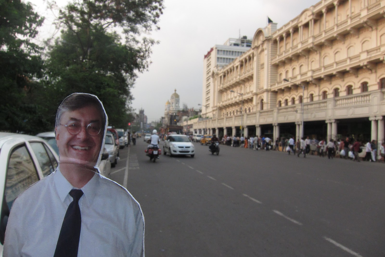 As we were wrapping up meetings last week, I subtly reached into my bag to pull out MR on a stick. He had to "visit" our cancer hospital project! Thinking that my live-and-in-the-flesh coworker would see me as crazier than he already does, I wanted to do this quickly and without drawing too much attention. That failed. Instead, Raju saw what I was doing and immediately got in on the game! Raju was so enthusiastic about taking MR on a stick out around town that we postponed our work plans to later in the evening just so we could get pictures while there was still daylight. Behold!
