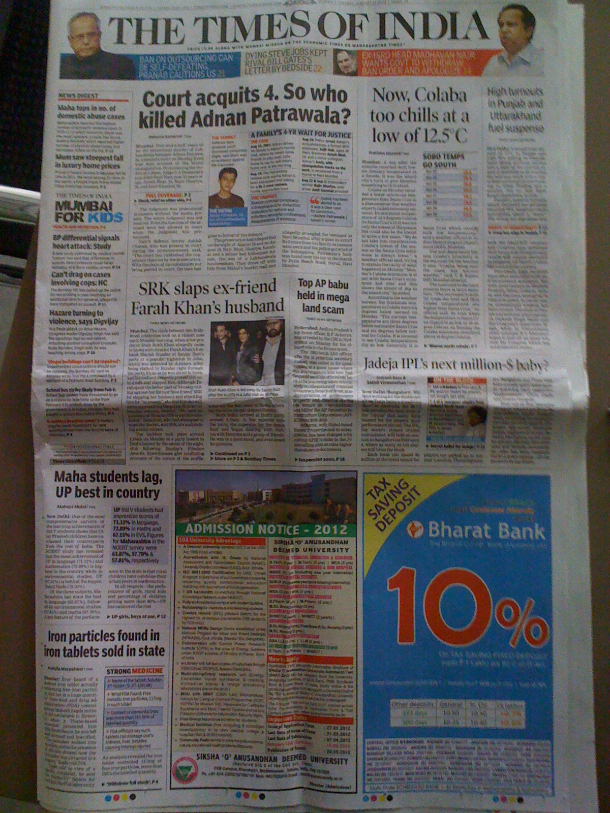 Most notable about the front page is that it is not unusual to have the entire thing covered in an advertisement. No joke, above and below the fold real estate given over to some doodad. Kind of remarkable. But on the days that there isn’t a giant advertisement for condos designed by Armani (don’t get me started), you will often see the front pages covered in stories about some new health concern and/or anything having to do with the stress about education here. Some days these topics collide and there will be a story about a new type of bellyache diagnosed as pre-exam stress or some such. Today we’re discussing how students in Maharashtra state are not meeting academic expectations. This is right next to an ad for admissions to some university. Interesting paradox.