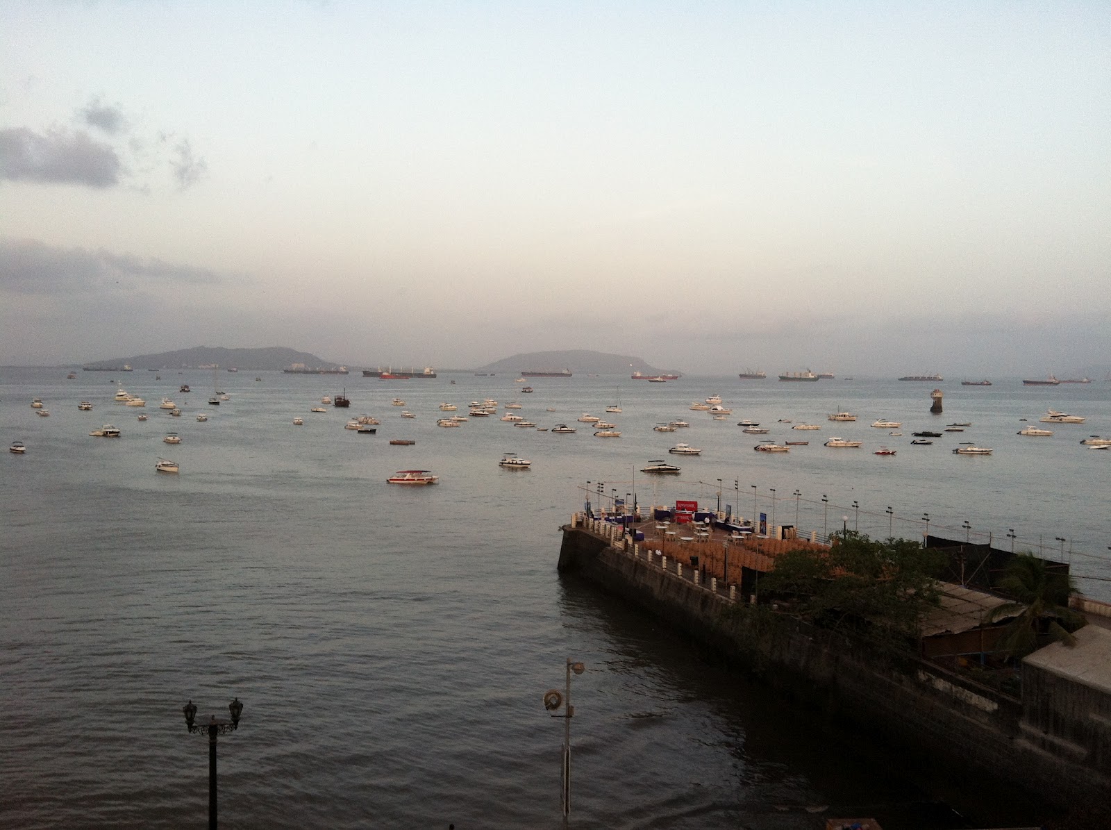 Take a look above the guy's head in the middle of the foreground. See the building with the dome and then a high tower to its right? That's the Taj Palace hotel. My office is two city blocks to the left of the hotel.